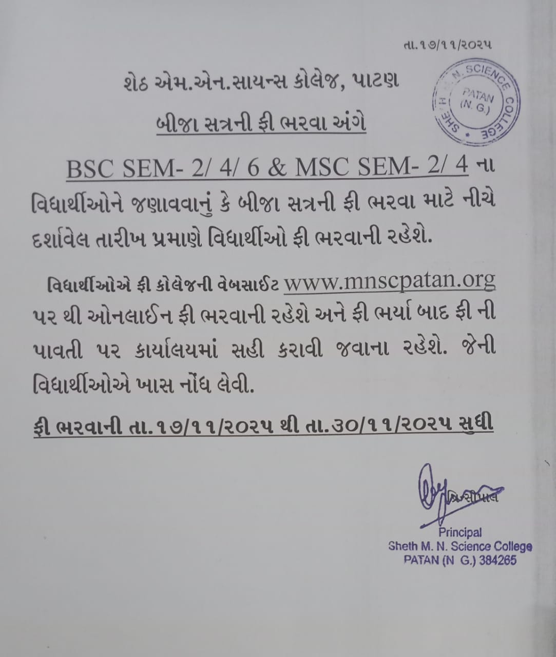 B.SC. SEM- II,IV,VI & M.SC. SEM – II & IV ફી ભરવા અંગેની સુચના