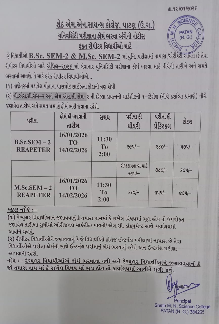 B.sc SEM-2/ M.sc SEM-2 યુનિવર્સિટિ પરીક્ષા ના ફોર્મ ભરવા અંગેની નોટિસ (ફક્ત રીપીટર વિધાર્થીઓ માટે )