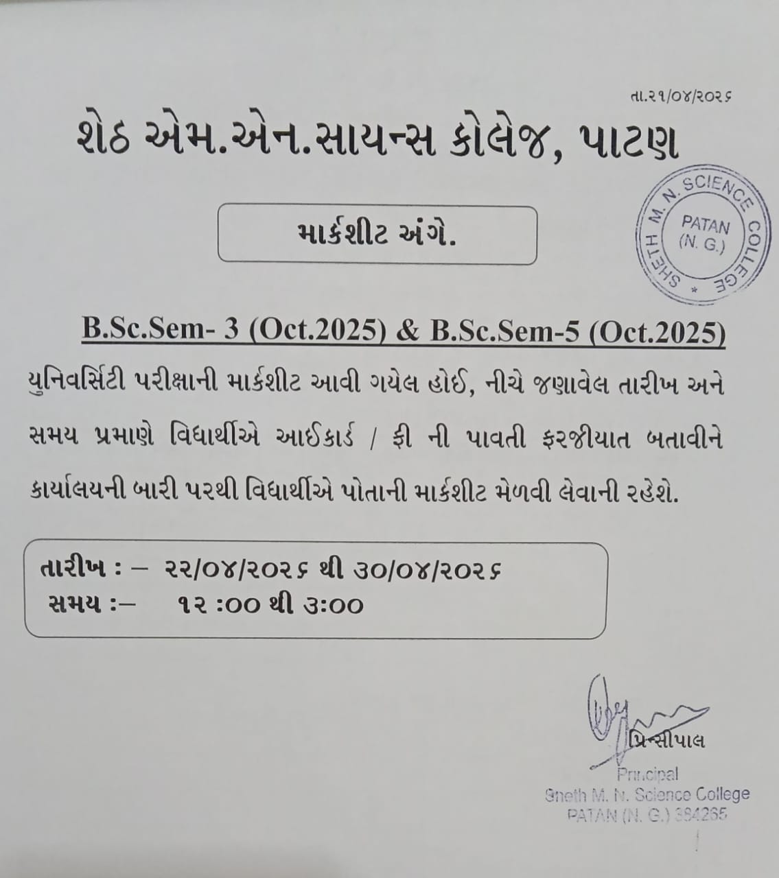 ઓક્ટોબર-૨૦૨૫ નાં ગાળામાં લેવાનાર Bsc sem-3, 5 & Msc sem-3 ના યુનિવર્સિટી પરિક્ષાના ફોર્મ ભરવા અંગેની સૂચના